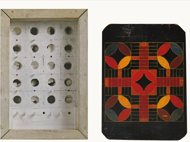 No less compelling, however, are certain home made goods, especially American pre-Industrial Revolution folk art, including hooked rugs, pieced quilts, woven baskets, paper band boxes and painted game boards. What makes them poignant is not just their inherent beauty, but also their less self conscious expression, their daily usefulness showing in wear, their place in domestic life.